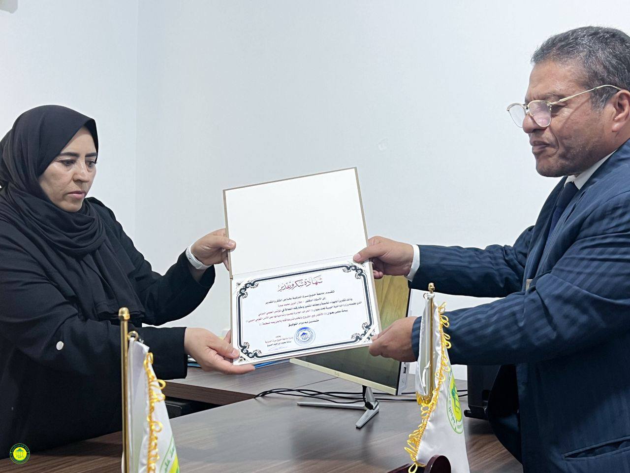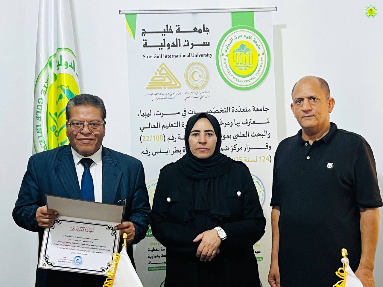 كرّمت إدارة جامعة خليج سرت الدولية ممثلة في الأستاذة سالمة أصبيع، الدكتور جلال صبرة عميد كلية القانون بالجامعة، تقديرًا لمشاركته العلمية المتميزة في المؤتمر العلمي الدولي حول "الجرائم العابرة للحدود وتداعياتها على الأمن القومي الليبي".